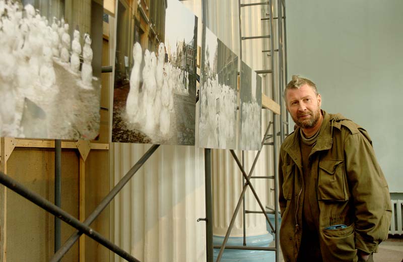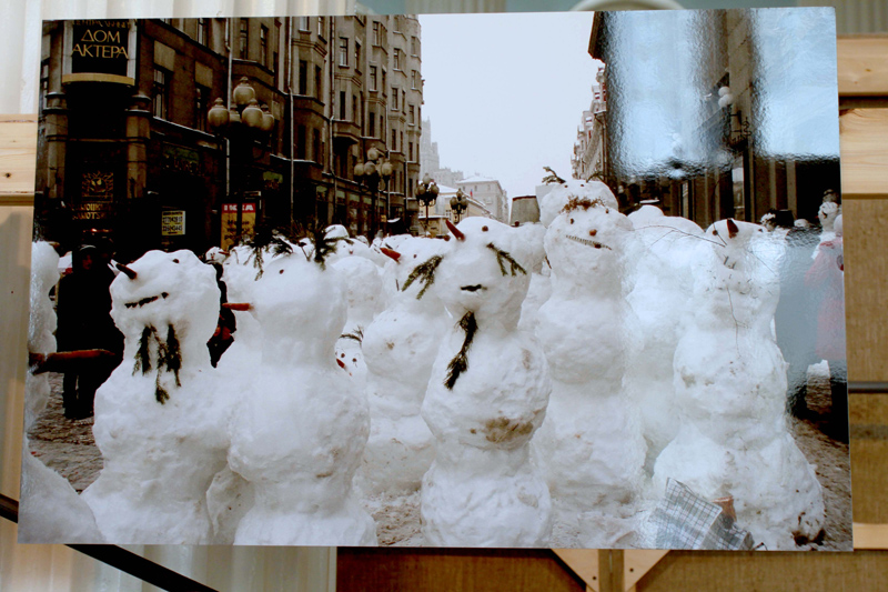 В Москве была бесснежная зима, и вдруг на улицы высыпала компания из 800 снеговиков. Художник Николай Полисский, съездив в деревню Никола Ленивец, объединил безработных жителей, превратив их в участников арт-проекта. Они и привезли снег в столицу, они и слепили снежных человечков. Это самая безобидная работа, чтобы понять другие, надо напрячь извилины. Нет, мы лучше плакаты будем малевать!