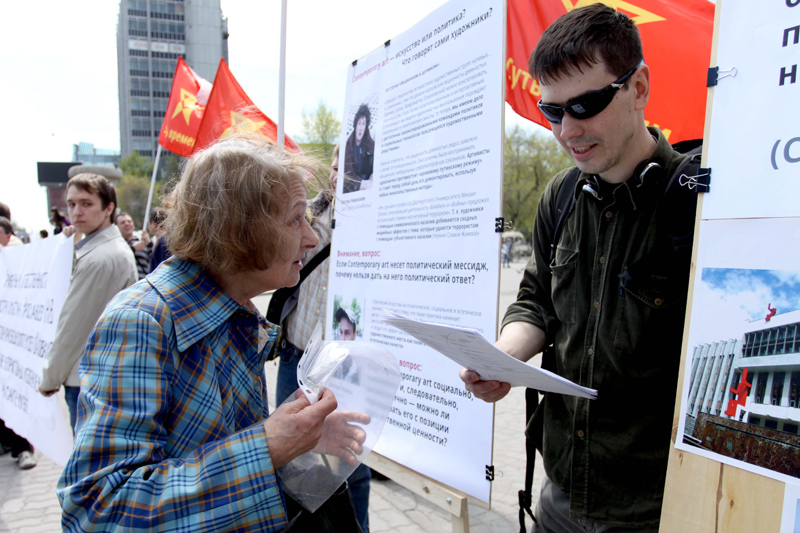 Скандал вокруг "Родины" выгодно использовать и в личных целях. Директор "Сибирского вернисажа" Анна Новолоцкая присоединилась к пикету с лозунгом, воплощающим ее чаяния. А до этого выступила в СМИ с открытым письмом, где требует сместить министра культуры Ярославцеву, ибо Ярославцева несправедлива к народным ремеслам, зато покровительствует современному искусству. Вчера властей на каждом углу ругали за запреты "Родины", а теперь они оказались крайними совсем по противоположной причине. Этому народу не угодишь, как ни крутись!