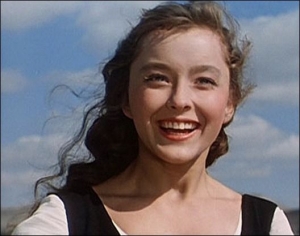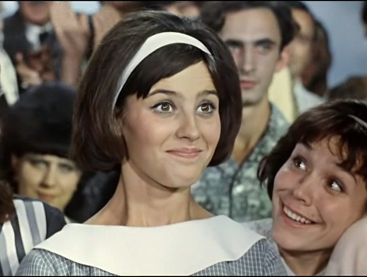 Еще интересный и нетипичный на первый взгляд образ принцессы – Татьяна Сергеевна из "Весны на Заречной улице" (1956). Юная выпускница педа, приезжающая вкладывать крупицы знания в головы рабфаковцев, многие из которых ее в полтора раза старше. По нынешним меркам, возможно вообще непривлекательная, полноватая и с пухлыми щеками. В смешном плаще, а-ля пенсионерка. С щербинкой, с волосами в самой простой прическе... Между тем, канон соблюден – прекрасна, недосягаема и зовет на подвиги. Посмотрите на это светлое лицо. Для такой девушки: