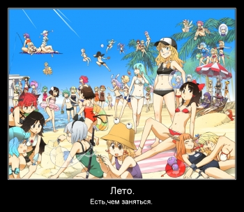 Вооот. Нет, понятно, что серии про пляж есть еще куча где. Да и аниме, построенных только на размахивании определенными частями девичьего тела в купальнике – тоже куча. Но мне сейчас жарко, и я не хочу вспоминать их все подряд. А вечером, когда солнце станет менее зверским, выключу комп и тоже пойду на пляж. Правда, по мотивам меня никто аниме рисовать не будет, но я ведь не за этим туда иду. А отдыхать. Я даже планшет с собой не возьму. Наверное. А читалку – возьму. А в ней есть интернет. Эх, потерянные мы люди. Сидеть на пляже и сидеть и в интернете. Жуть. Зато есть плюс – не скучно в любом случае. В конце должен быть обязательный вопрос или обязательный опрос – но сил на него у меня уже нет. Скорейшего вам вечернего похолодания или мощного вентилятора.