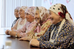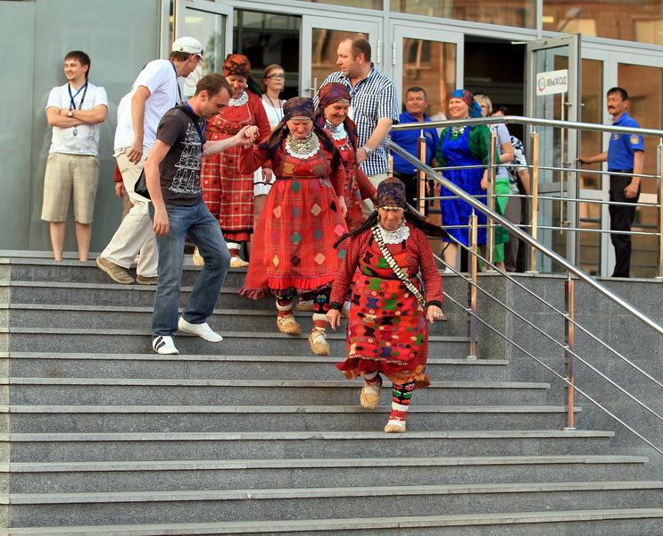 Перед выступлением "Бурановские бабушки" пообщались с журналистами. Корреспонденту MORS'а открылась галерея женских образов российской глубинки, эдакие 8 женщин (их вместе с арт-директором, на самом деле, 10, но художественный руководитель Ольга Николаевна Туктарева по семейным обстоятельствам не смогла приехать в Новосибирск, другая участница не бывает на гастролях по причине возраста). Одна активно отвечает на вопросы, другая смешливая, но скромная, третья кокетливо держит ладонь у лица и глядит "загадочно", четвертая, будто ведунья, на все расспросы отмахивается "тайным знанием", которое не поддается разглашению. И все ведь взаправдашние. Вопрос журналистов по поводу костюмов и повседневной одежды ввел участниц коллектива из удмуртского села Бураново в легкое недоумение: "Да мы почти так же и ходим". Впрочем, без сопровождения никуда. "У-у-у, прохода ж не дадут!" – сетуют старушки.