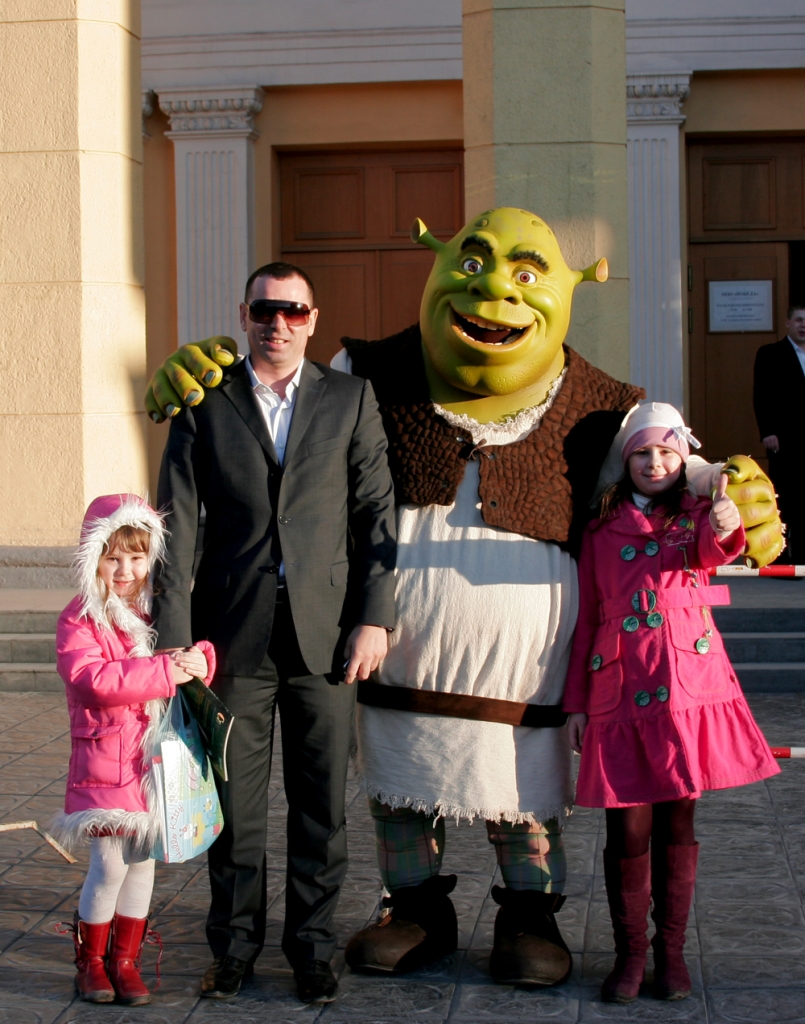 Папу Римского в народ возят на папамобиле. По центру Новосибирска Шрэк передвигался на шрэкомобиле. Мерседес Спринтер, украшенный стикерами с мультсценами, курсировал в четверг вечером по центру города, а затем возле кинотеатра "Победа" вполне дружелюбный огр (ай, что деньги и слава делают! Вспомните его отношение к популярности в первой серии: "Живу на болоте! Понатыкал табличек! Огромный и злобный! Этого мало, чтобы добиться уединения?") пожимал руки поклонникам и фотографировался со всеми желающими. В пятницу стихийная фотосессия продолжилась в холле "Синема Парка". Полтора десятка ребятишек от 1,5 до 15 лет, улыбаясь в родительские фотокамеры, на секунду замирали под людоедской рукой и трогали знаменитые уши, из которых когда-то так удобно было вытаскивать серные свечки для сервировки ужина.