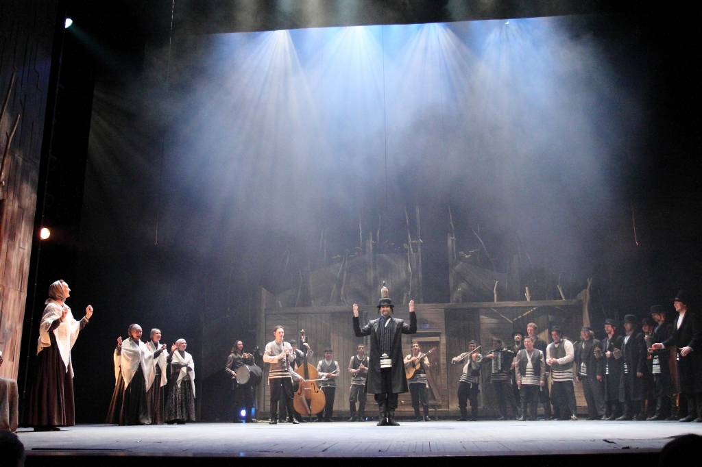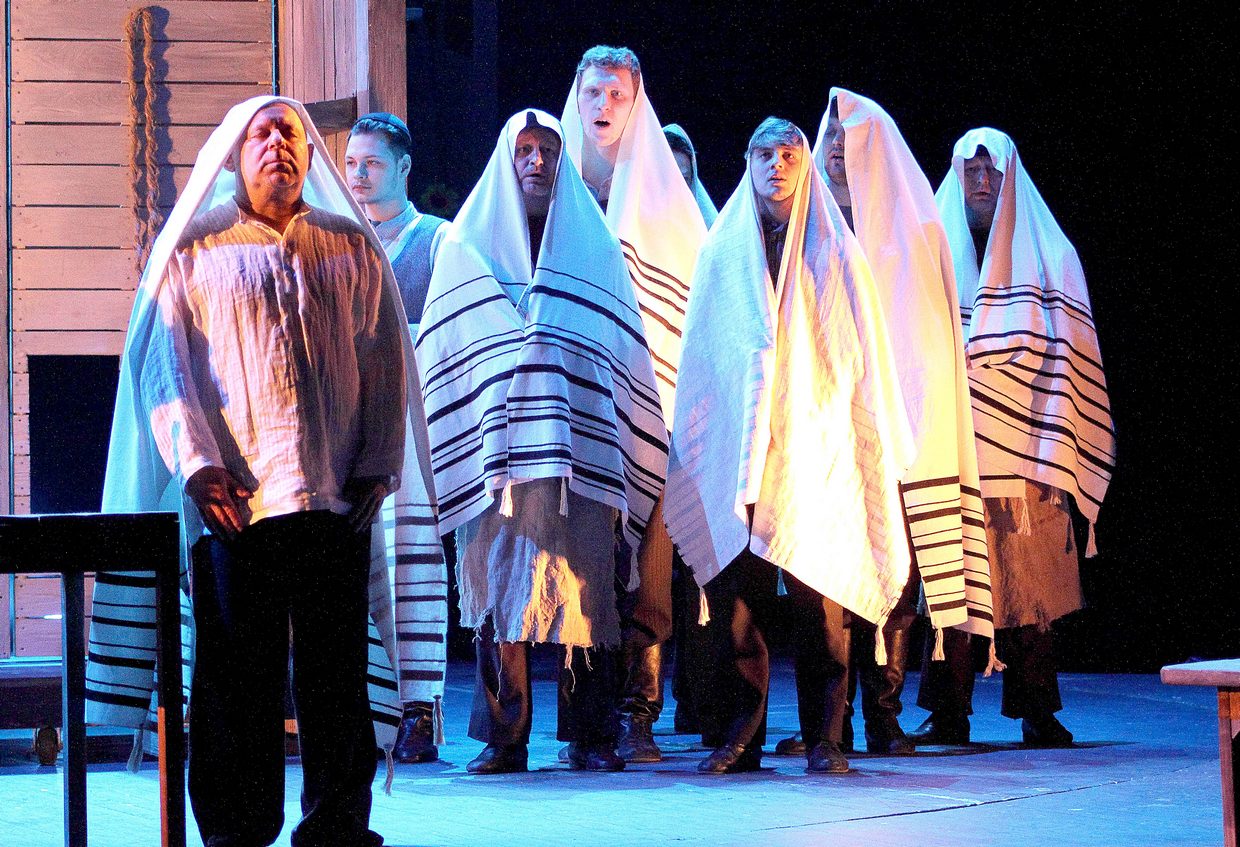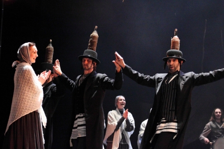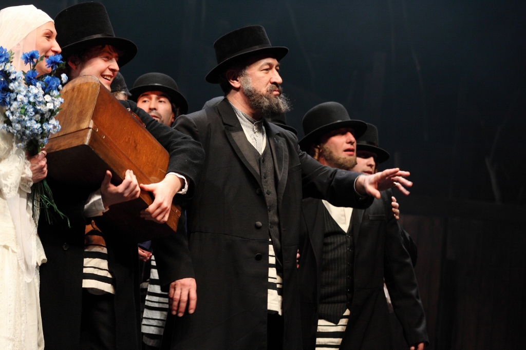 Полсотни артистов, еврейский оркестр, танцы с цирковыми трюками, свадьбы, проклятья, погромы, ссылки, молитвы, рассуждения о милости божьей – все это вместилось в один спектакль. Кто знаком с пьесой Григория Горина, тот знает, сколько времени и сил персонажи уделяют религиозным ритуалам. Обряды и обычаи – незыблемая форма жизни, которую никто не пробовал даже пошатнуть. Для евреев праздновать субботу – это святое, а не помолиться перед обедом – кощунство. Пашут с утра до вечера, но ходят в обносках, живут мирно, но неугодны властям. Иудеи, воспитанные в покорности всевышнему, обращают к нему свои вопросы, но не получают ответов. "Вся наша жизнь – сплошная неудача," – говорит раввин, которого отец небесный явно не погладил бы по головке за такие откровения.