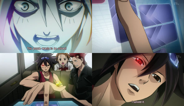 Но так как наша история про супербитву с супермозгом, Кайто отхватил себе в нелегкой борьбе подтверждение своей мозговой гениальности. А еще получил странный контракт Орфея, который дал ему неплохой бонус – устройство Фи Брейн, которое позволяет использовать мозг на полную - на все 100%. Правда, непонятно – если главный герой и так самый умный, зачем ему искусственные прилады? Надеюсь, что ближе к середине сезона необходимость этой могучей штуки станет более очевидна. Вот так он выглядит